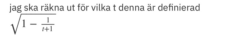 Henning skrev:Uttrycket måste för att vara definierat för reella tal vara positivt eller =0 under rottecknet.