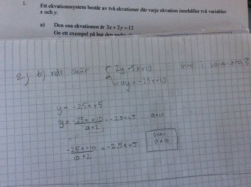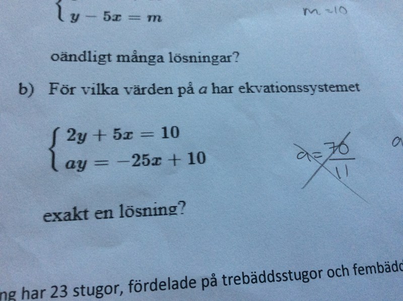 Där och . För att systemet ska sakna lösning gäller: . Vilket gör att du kan lösa ut för vilket värde på systemet saknar lösning säg att , men du vill att systemet ska exakt en lösning då behöver .