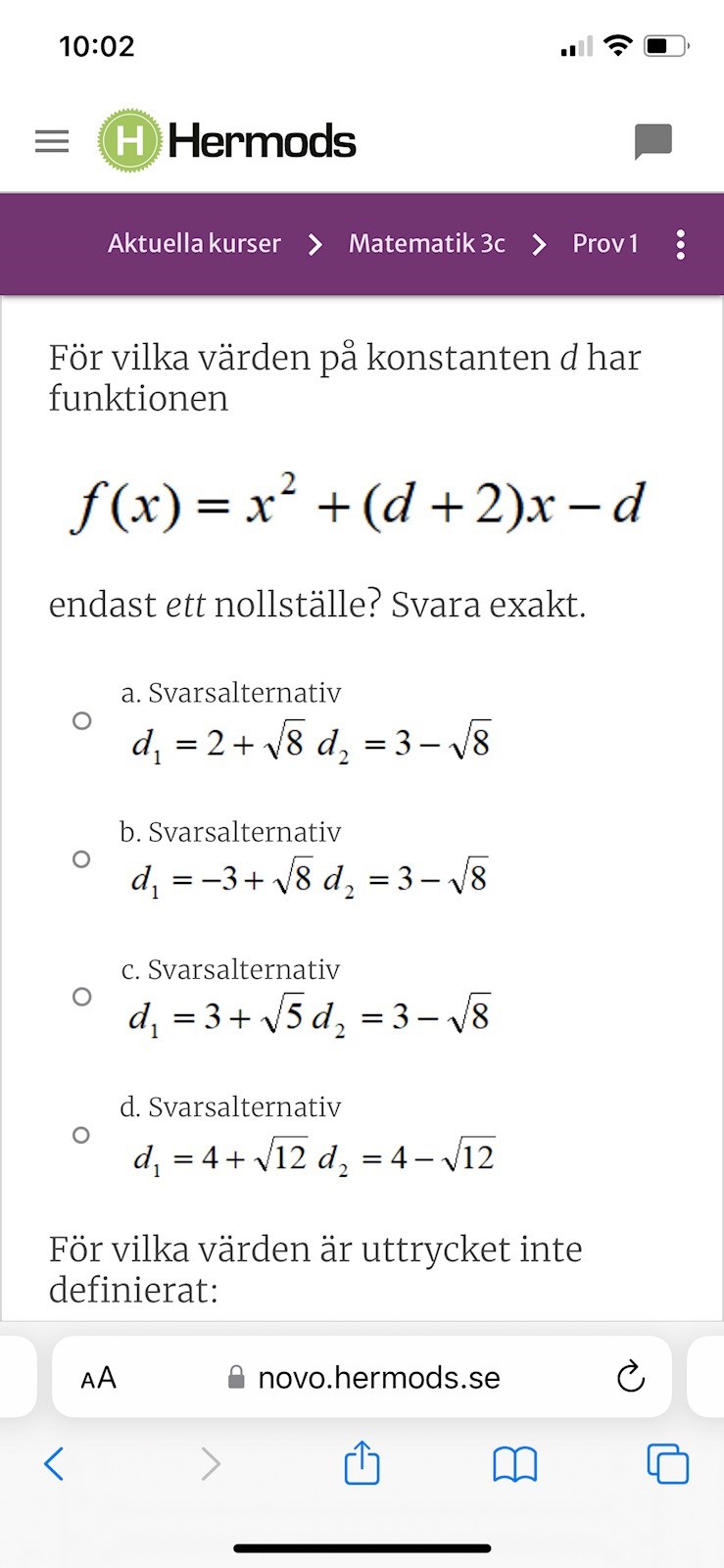Hej. Jag håller på och löser uppgiften ”För vilka värden på konstanten d har funktionen f(x)=x^2+(d+2)x-d endast ett nollställe.