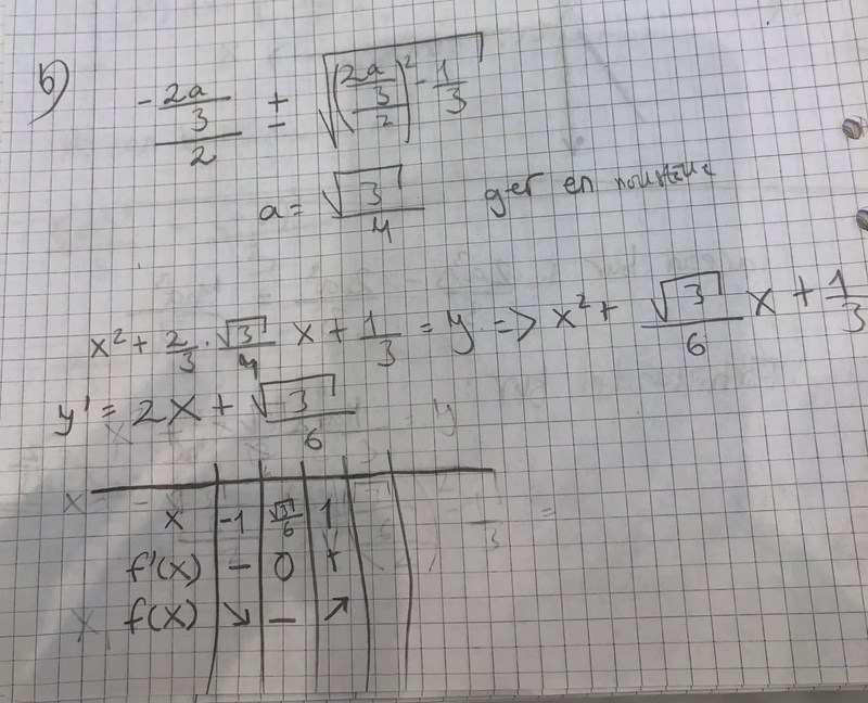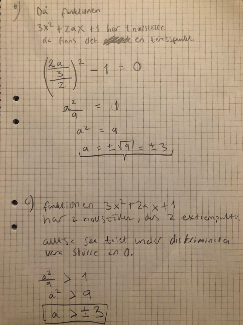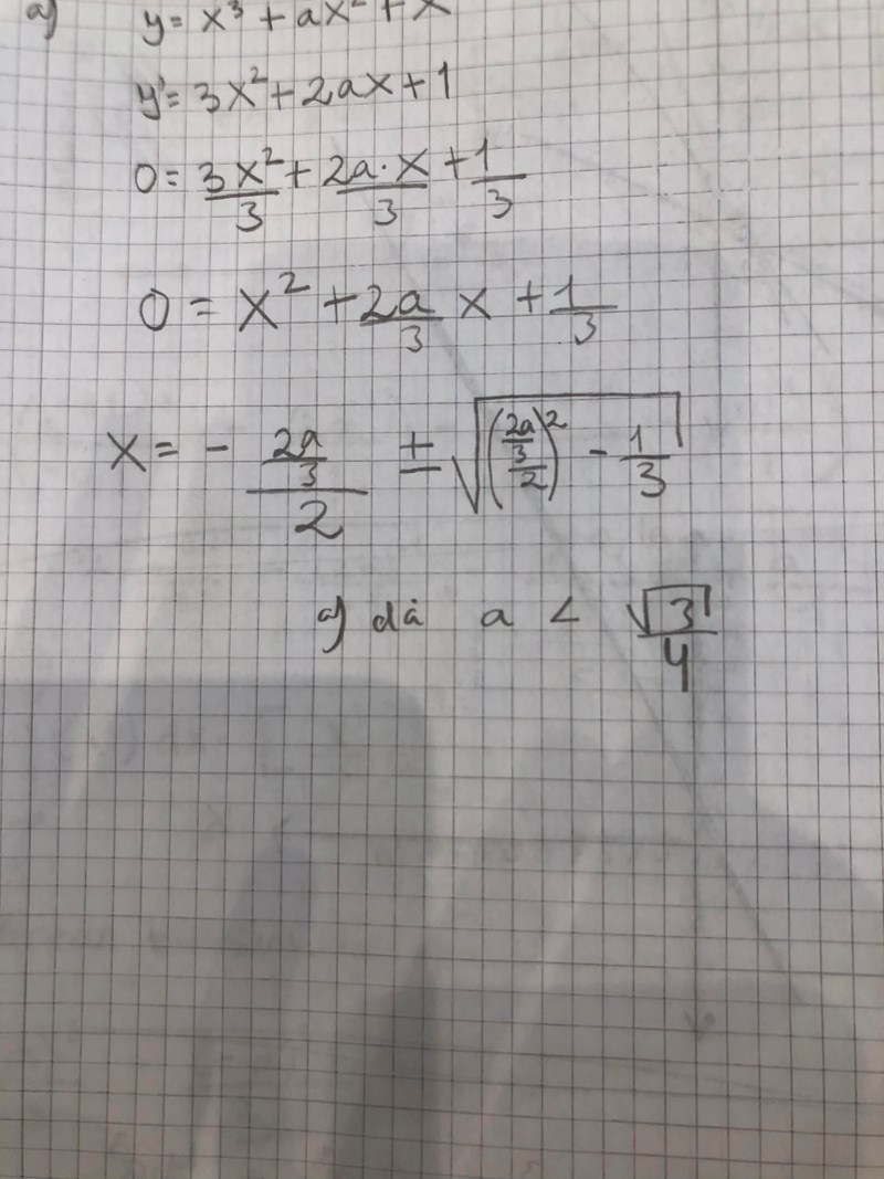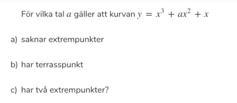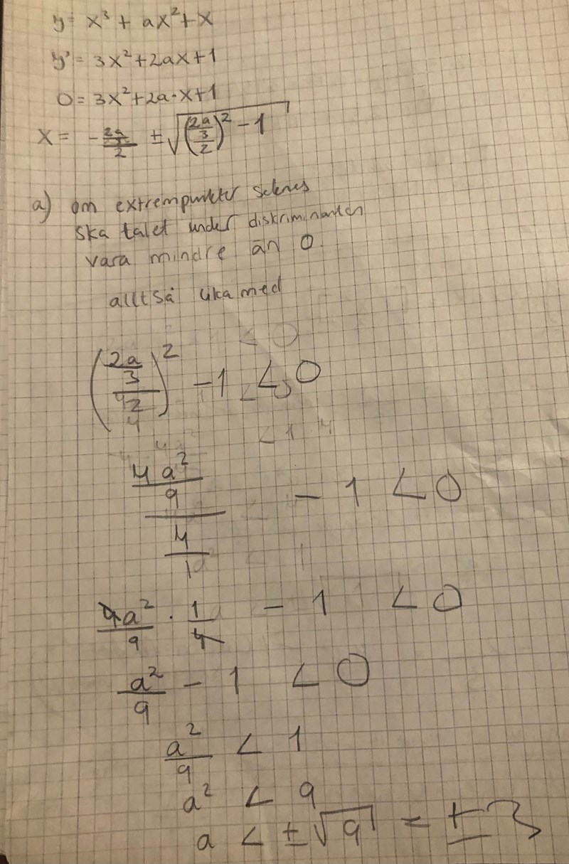 därefter satte jag derivatan till 0. Då fick jag att det inte finns några extrempunkter om x< roten ur(3)/4