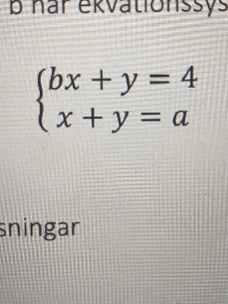 b är en obekant siffra. Den har samma funktion som tvåan i , bara det att vi inte vet vilket tal b har. Ännu. :) Om vi varierar värdet på b får vi olika räta linjer. Om dessa linjer ligger på varandra, finns en oändlig mängd skärningspunkter, medan det endast finns en skärning om linjerna inte är identiska. Om linjerna lutar lika brant, men har olika m-värde, har linjerna ingen skärning, och därmed har ekvationssystemet inga lösningar. Ditt uppdrag är att hitta värden på a och b så att dessa olika scenarion sker. :)