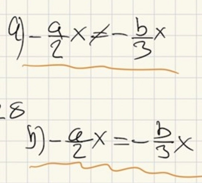 Här är du, som du skriver, något på spåret. Men villkoren är att k-värdena ska vara olika i a) och lika i b), vilket innebär att -a/2 -b/3 i a) och att -a/2 = -b/3 i b). Du ska alltså inte ha med något x i dessa uträkningar: