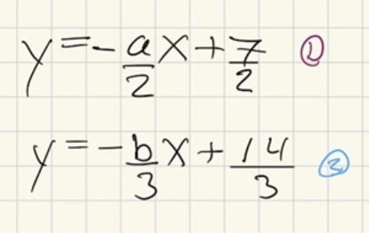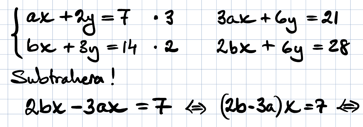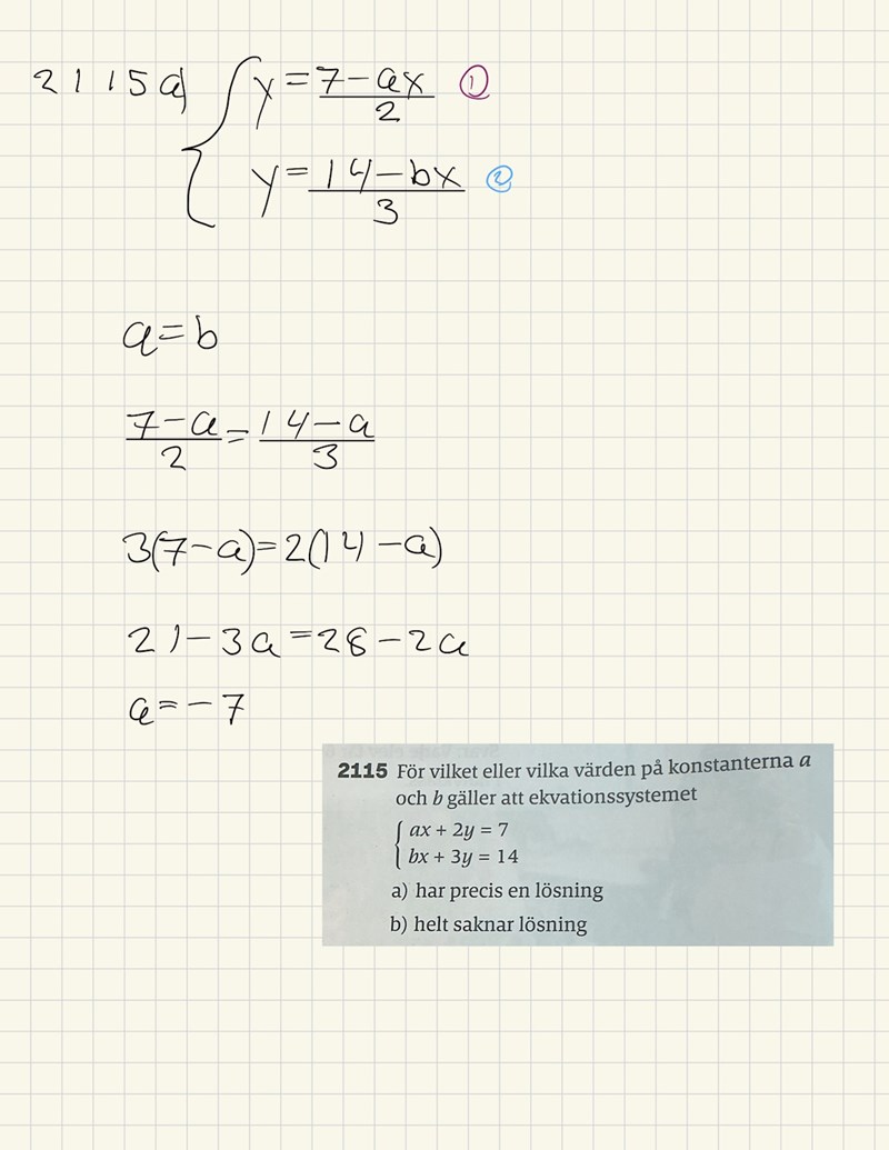 Om x = 1 så är ena y-värdet (7-a)/2 och det andra y-värdet (14-b)/3. Men det betyder inte att a = b, inte heller att det saknas lösning.