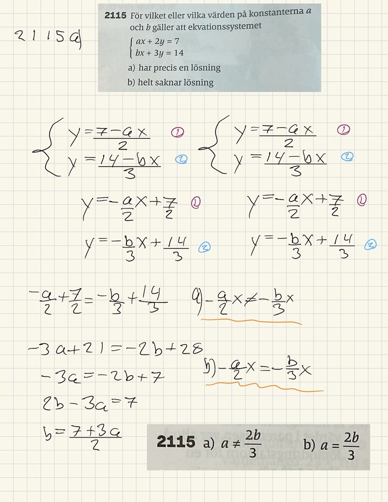 För vilka värden på konstanterna a och b gäller att ekvationssystemet a)..;b)… (nivå 3/3)