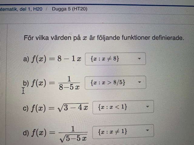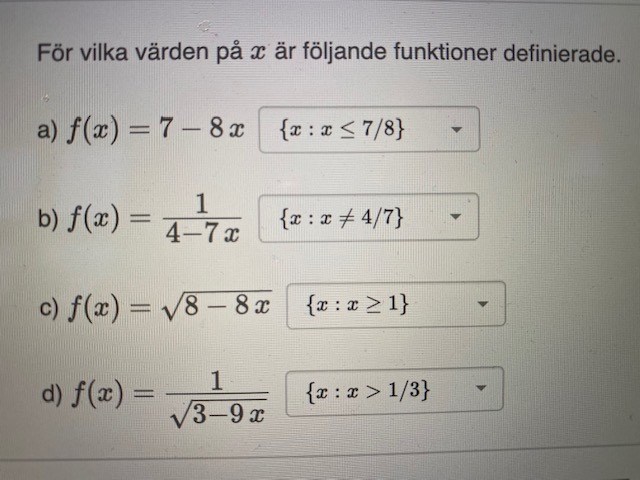 Ja så i tex d) så får x inte var 1? det är så många olika svars-alternativt till frågorna och allt ser likadant ut så blir förvirrad.