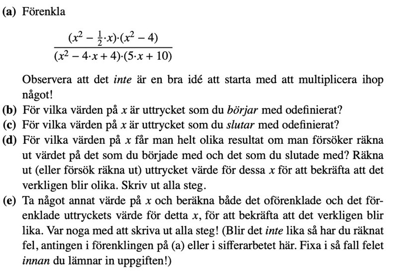 Jämför definitionsmängd på det uttryck du började med och det uttryck du fick efter förenkling.