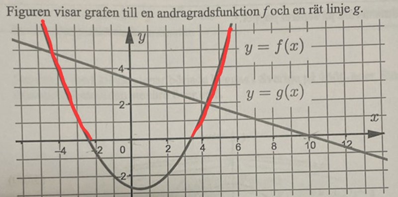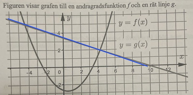 På b-uppgiften efterfrågas de x-värden för vilka både parabeln (y = f(x)) och den räta linjen (y = g(x)) ligger ovanför y = 0, dvs ovanför x-axeln.