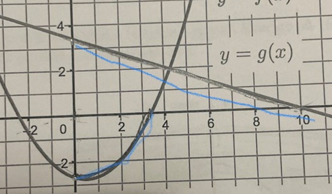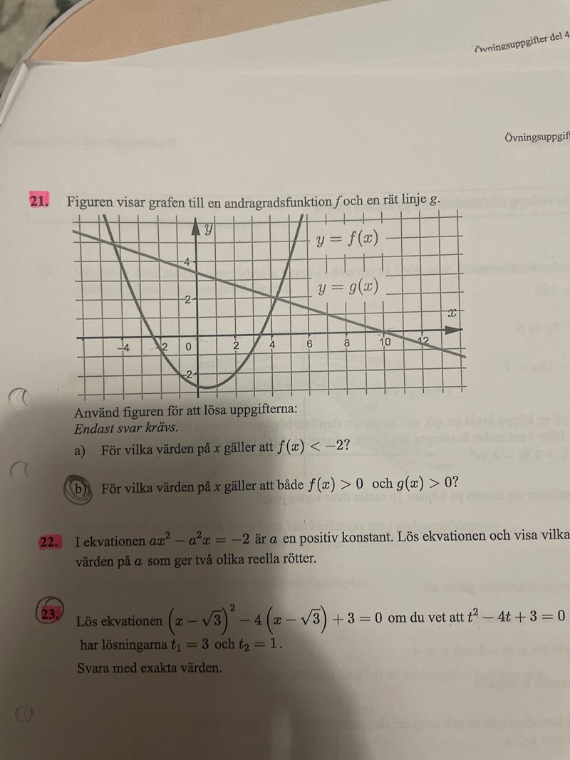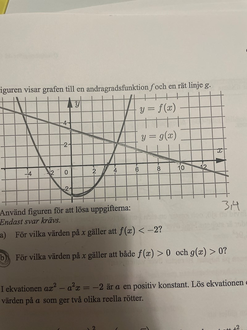 På b-uppgiften efterfrågas de x-värden för vilka både parabeln (y = f(x)) och den räta linjen (y = g(x)) ligger ovanflt y = 0, dvs ovanför x-axeln.