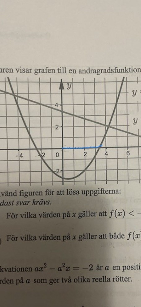 På a-uppgiften efterfrågas de x-värden för vilka parabeln (y = f(x)) ligger under y = -2
