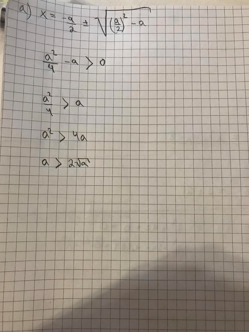 dela med a i sista steget ist för rot sen kan a vara negativ så 0> a >4. du kan också tå pq på a^2 -4a