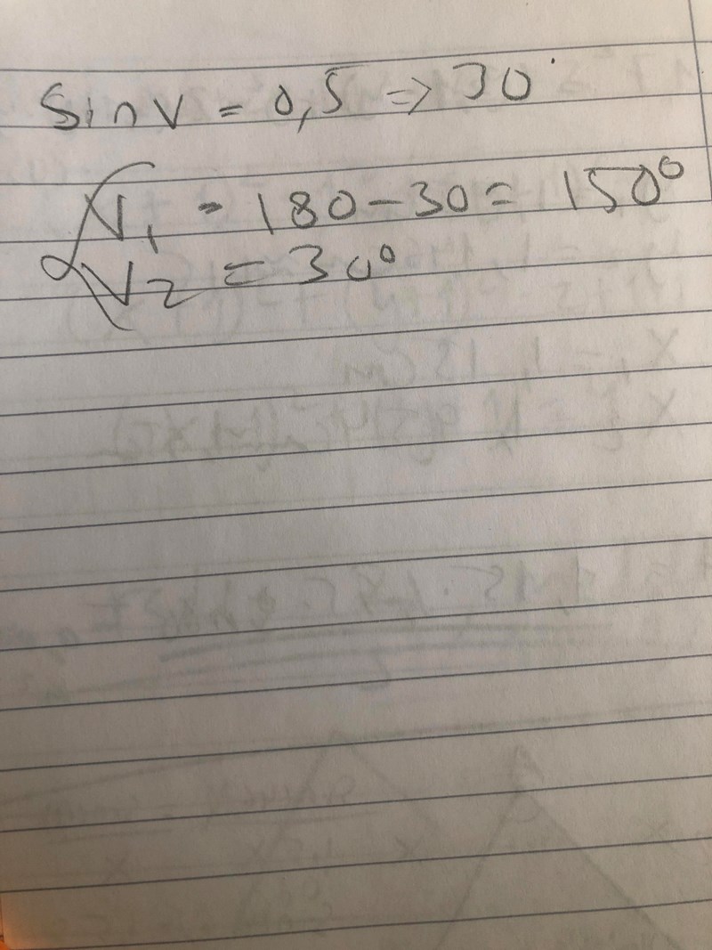 För vilka vinklar v i intervallet 0°<=v <360° gäller att sin v= 1/2?"
