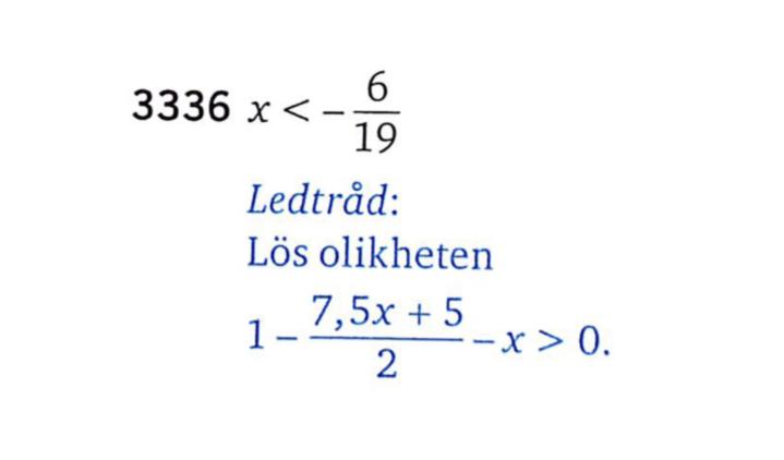 Jag testade att ställa upp som facit visar i ledtråden 1−( 7,5 x+5) / 2−x > 0 och flyttade över x till andra sidan genom att +x på båda sidorna så det blir 1−( 7,5 x+5) / 2 > x. Sen testade jag lite olika metoder men inget av dem fungera