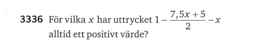 för vilka x har uttrycket 1−( 7,5 x+5) / 2−x alltid ett positivt värde?