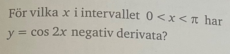 Nu förstår jag inte riktigt vad du menar. Är du med på att vi vill hitta det intervall där hela derivatan är negativ? Är du i så fall med på att vi måste hitta det intervall då hela derivatan är positiv, dvs. det intervall där sinusfunktionen (bortser från minustecknet framför nu) blir negativ?