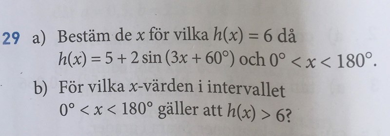 Ett sätt som jag kom på att man kan lösa b-uppgiften på är att man har med sig "gränserna" från a-uppgiften. Vi vet ju att vid x=30 grader, x=110 grader och x=150 grader så är h(x)=6. Vi vet att funktionen är en sinuskurva. Vi kan då sätta in olika värden på x som är större och mindre än våra gränser och på så sätt analysera var kurvan har y-värde över 6. Förslagsvis kan man ta när x är 20 grader, 40 grader, 100 grader, 120 grader och 160 grader.