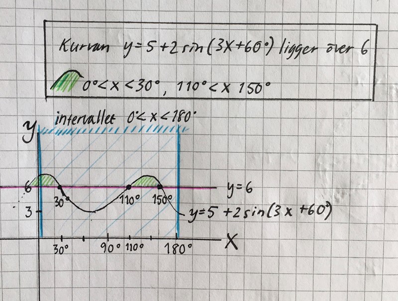 Du vet att kurvan skär h=6 precis då x är 30, 110 och 150. Då är frågan sen, "mellan vilka av de här är kurvan ovanför h=6?". Eftersom du vet hur en sinuskurva är formad, vet du också att intervallen måste bli "varannan över, varannan under". Då finns det bara två alternativ: