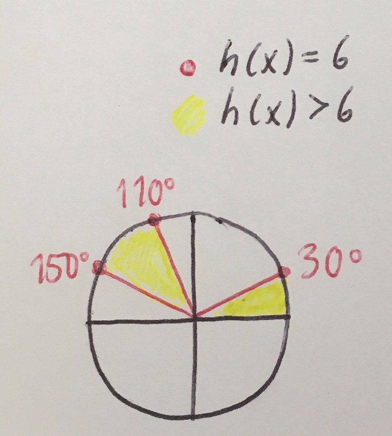 Då blir svaret att h(x) är större än 6 när x är större än 30, större än 110, respektive större än 150 grader, vilket är fel.