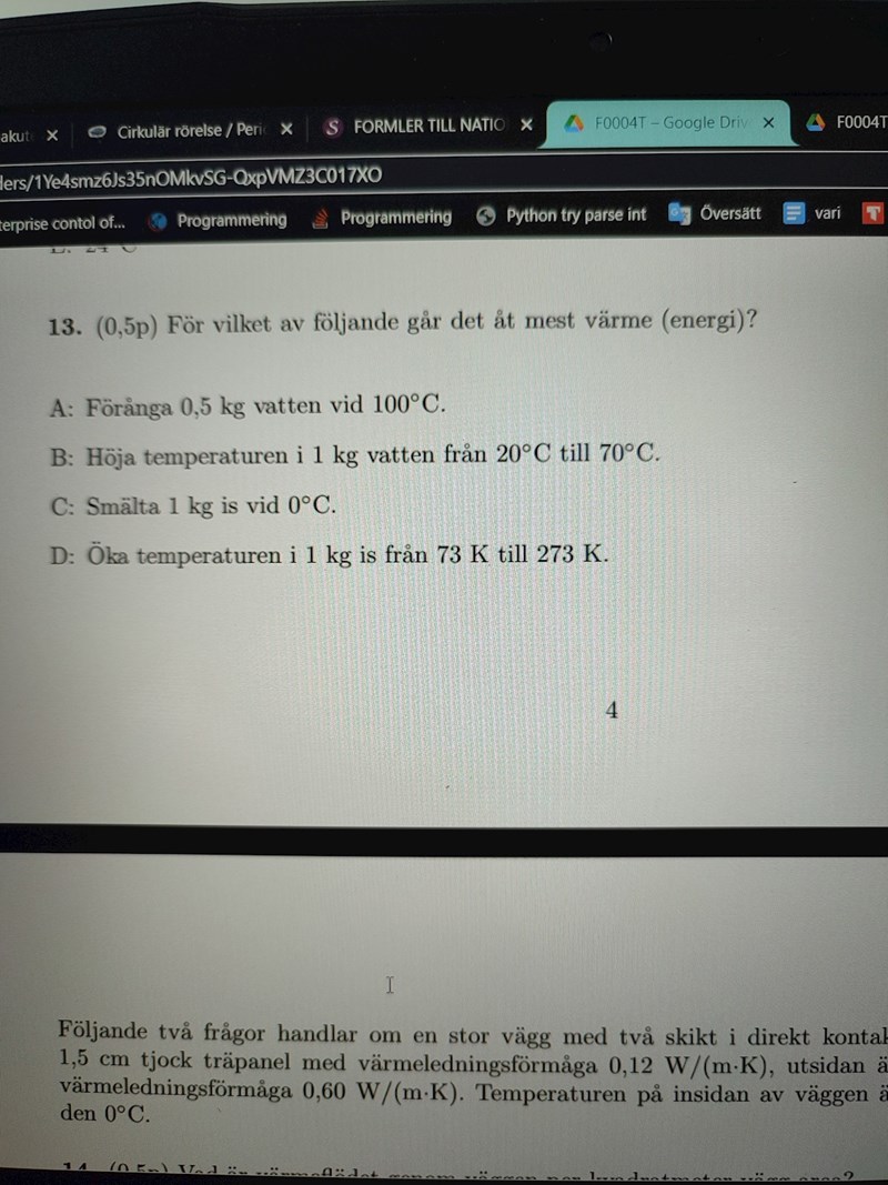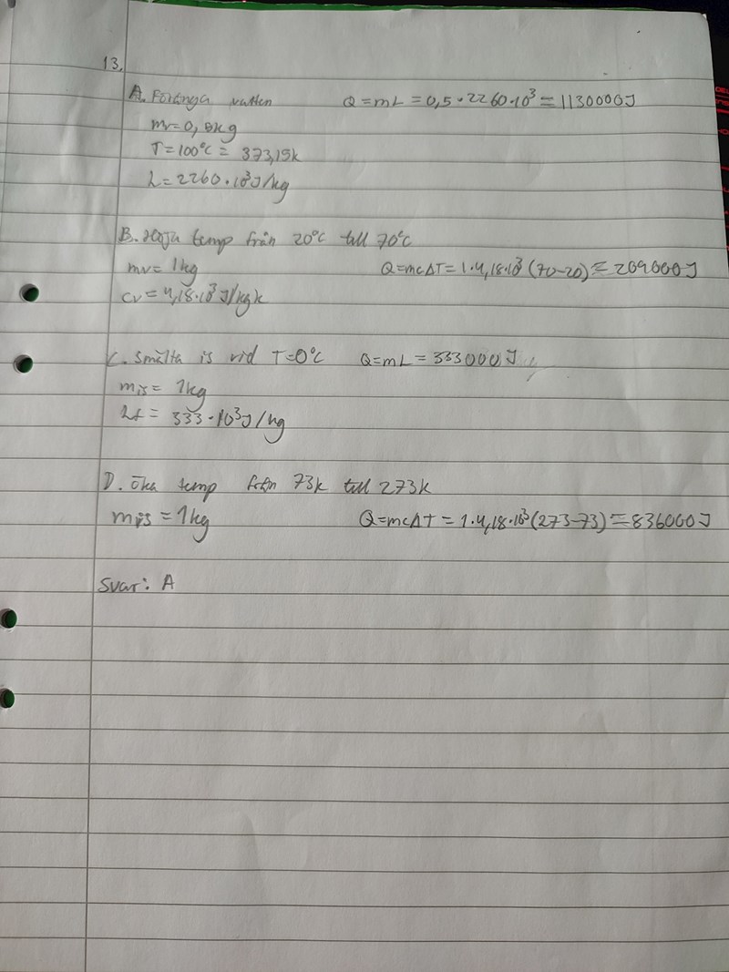 Ah okej tack! Nu använde jag den specifika värmekapaciteten för is (2050J/(Kg*K) och fick att Q i D. = 410000 sp Svaret på vilket av i alternativen som det går åt mest värme borde fortfarande vara A?