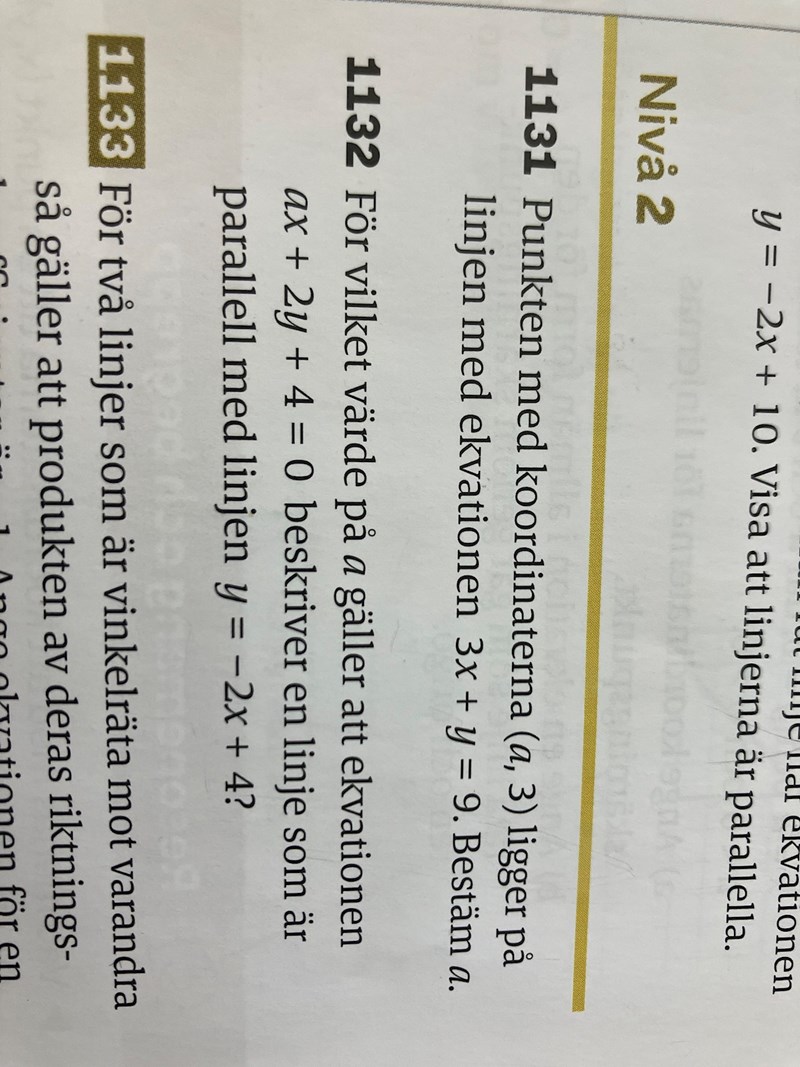 Jag tänker att jag först ska skriva om ax + 2y + 4 = 0 så att ekvationen ser ut som den andra. Men jag fastnar på hur jag skulle skriva ut ax och hur a ska kunna bli 4. Några förslag?