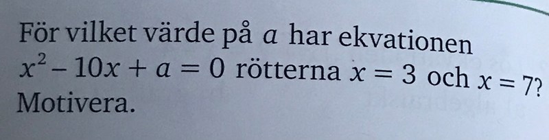 Genom att sätta in x = 3 i andragradsekvationen fick jag fram 9 - 30x + a = 0 verkar det stämma? Vad ska jag göra sedan?