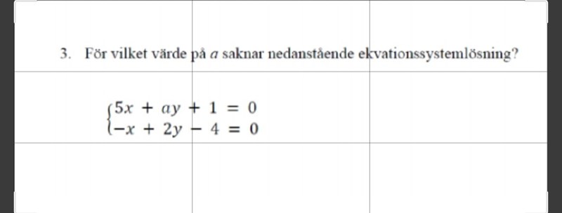 För vilket värde på a saknar nedanstående ekvationssystemlösning
