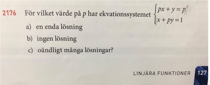 ifall vi stoppar in p=1 i ekvationerna kommer ekvation 1 vara samma som ekvation 2 och därför ha oändligt många lösningar, men ifall p=-1 kommer vi ha vilket inte har någon lösning