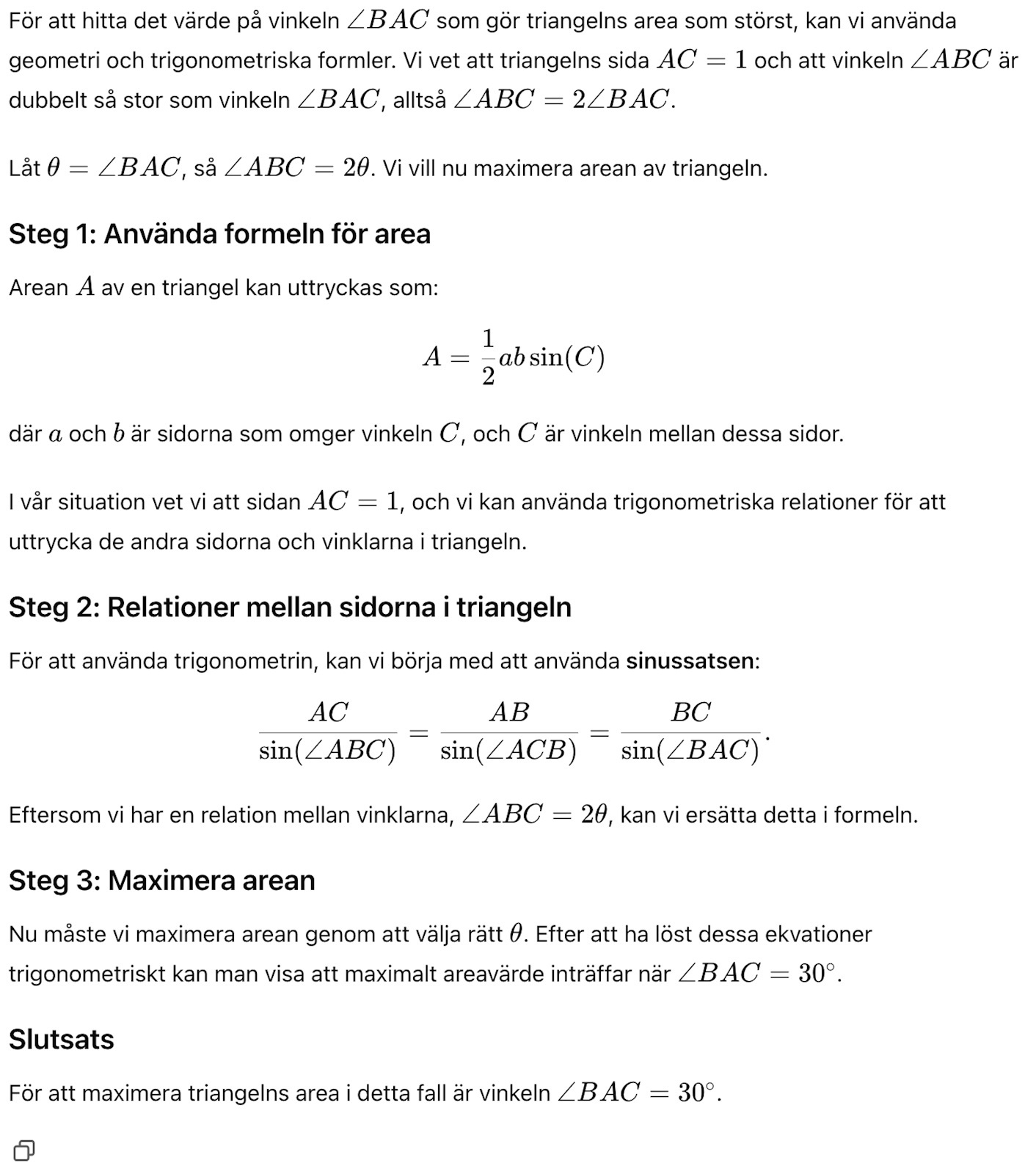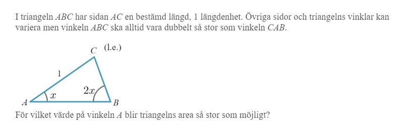 För vilket värde på vinkeln A blir triangelns area så stor som möjligt?