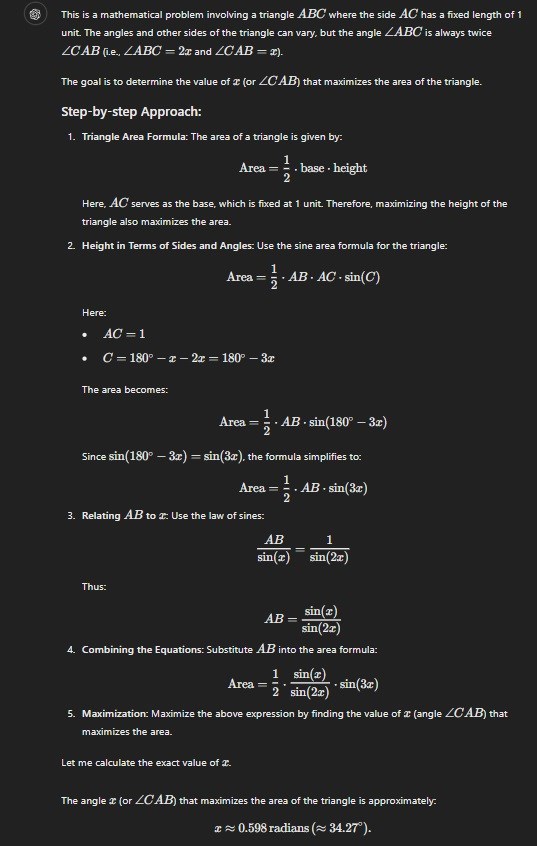 Det sista steget är det svåra, att visa att cos(x)=sqrt(1+sqrt3)/2 ger max. Det klarar den inte av (ännu). Den kan inte ge det exakta svaret ej heller motivera att det är maximum som uppnås. Kunskapsmatrisens sista steg är enkelt vid en grafisk lösning, men inte så trivialt analytiskt. Om ett par år så blir det mkt. intressant att se dessa lösningar.