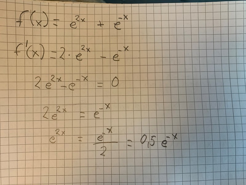 För vilket värde på x har grafen till funktionen f (x) = e^2x + e^−x lutningen noll?