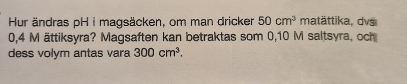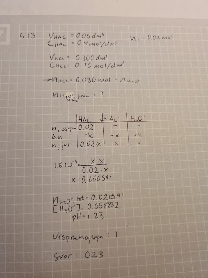 Det jag försöker göra är att ta reda på hur många mol H3O+ det är i lösningen, börjar med att ta reda på antalet i HCL-lösningen vilket jag får till 0.030 mol och sedan tar jag reda på du många mol H3O+ som HAc avger, vilket jag får till 0.000591 mol. Adderar ihop det och dividerar med totala volymen, då får jag koncentrationen H3O+ (får 0.058832)