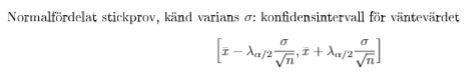 Om konfidensintervallet är 95% och konfidensgraden därmed är 0,05/2, vilket ger faktorn 1,96. Jag tittade i formelsamlingen i en gammal kurs och för ett normalfördelat prov gäller formeln: