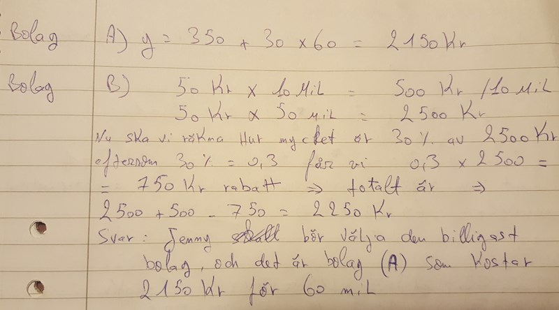 Bolag B: 50 kr/mil de första tio milen – därefter 30% rabatt!