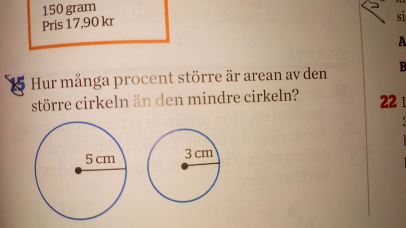 Ja, du satte att den lilla cirkeln var 100%, och försökte sedan uttrycka den stora cirkeln som den lilla. Då fick du att det krävdes 278%, alltså 2,78 stycken små cirklar för att skapa den stora. Vi räknar bort den lilla cirkeln, för att ta reda på hur mycket större den stora cirkeln är jämfört med den lilla: 278% - 100% = 178%.