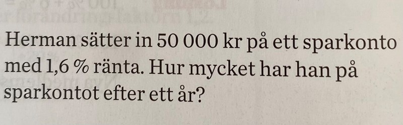 Jag vet att jag måste lösa den genom att ta 50 000 • 1,6 %, men när jag ska skriva 1,6% i decimal form förstår jag inte hur det kan bli 0,016