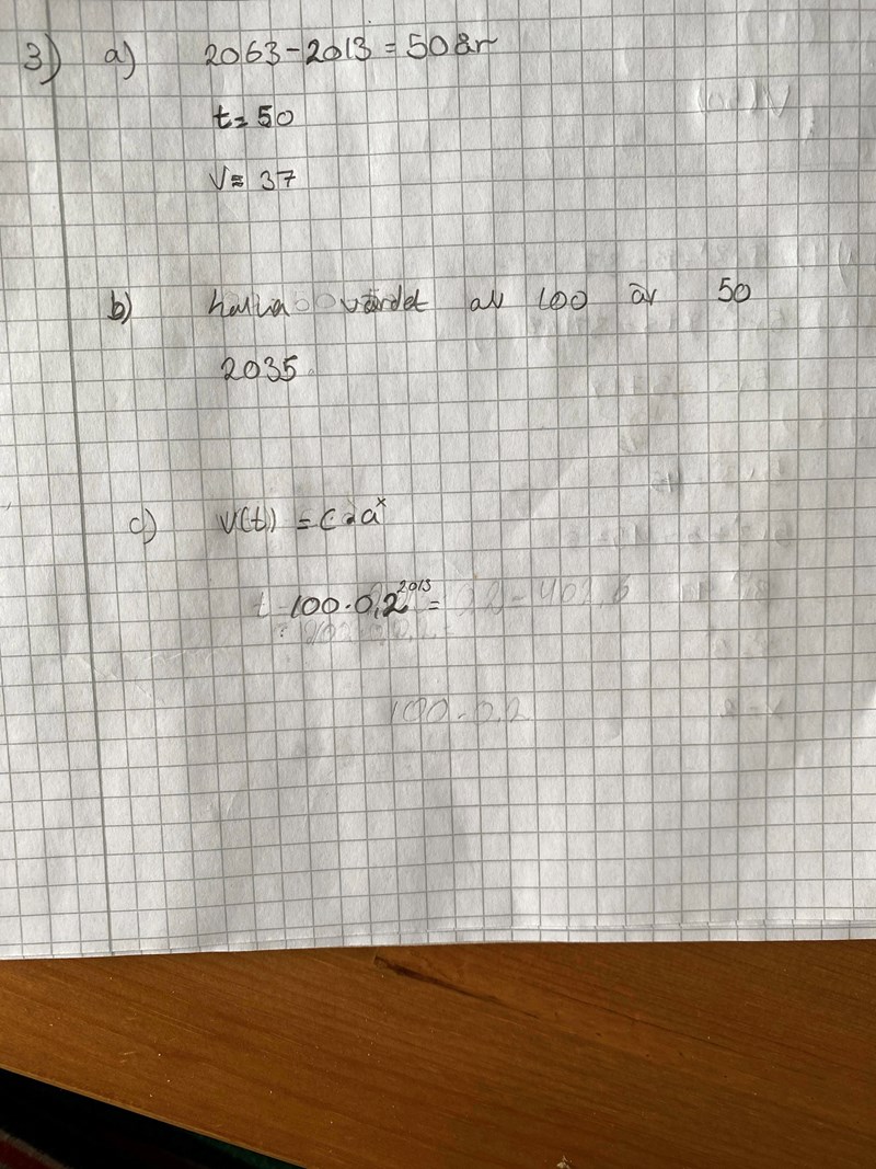 På c)  2013*0,2 är inte riktigt. 2013 är året då det börjar men det är inte året du ska sätta in i formeln utan ursprungliga värdet vid år 2013. V (t) står för värdet och det ursprungliga värdet är när t = 0