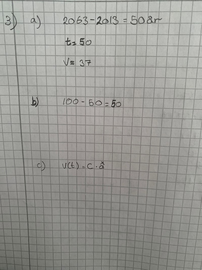 Innan du gör c) så vill jag bara säga att a) blev rätt men inte b). S gör b) först innan du gör c). Halva värdet av 100 är 50 det är riktigt men frågan var vid vilket år det sker. Så titta i grafen på vilket år det sker. Kom ihåg att år 0 i grafen inte är år 0 utan år 2013. Försök sen göra c)