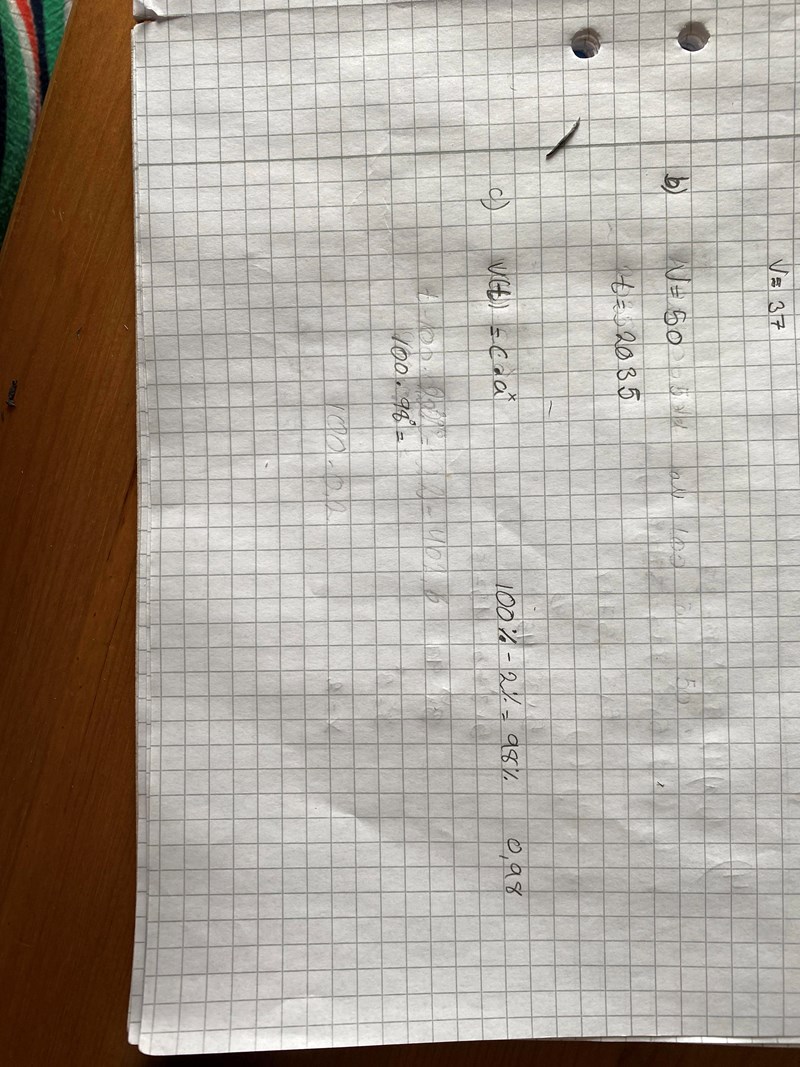 Angående c) så är  förändringsfaktorn  0,98 som du räknat ut och du har ev. skrivit 98% i svaret, svårt att se,  och V(0) = 100 det är riktigt. Men du har nog glömt t och inte skrivit V(t)