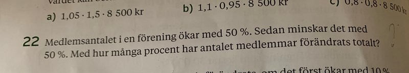 Om du har 100% och det ökar med 50% så blir förändringsfaktorn 1,5. När medlemsantalet minskar med 50% så blir förändringsfaktorn 0,5. Multiplicera dessa. Har ni lärt er om ränta på ränta-principen?
