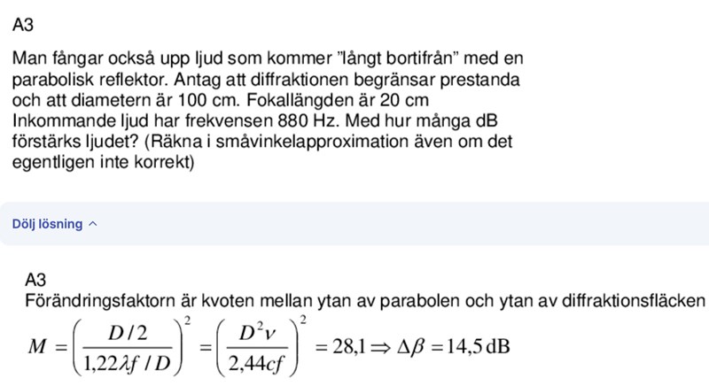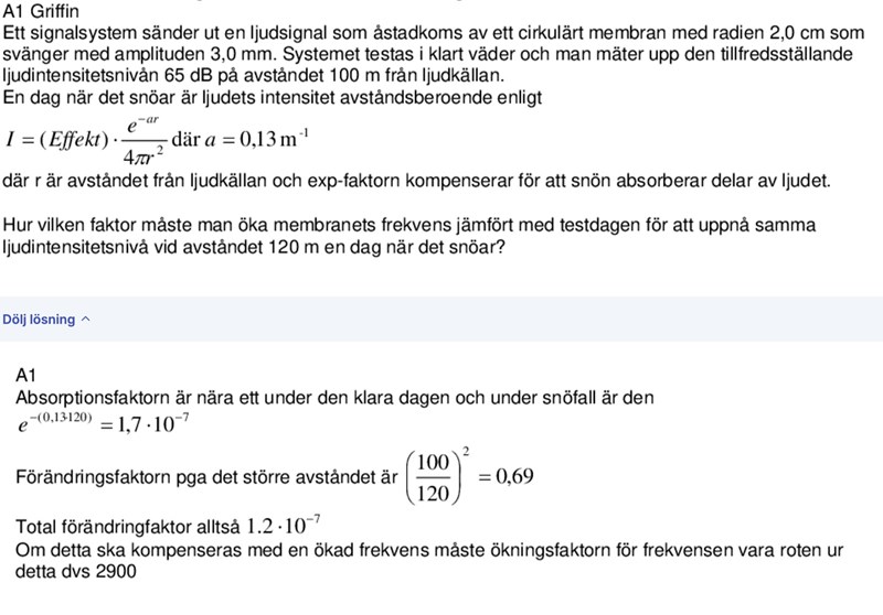 I första exemplet är ju dock det enda som förändras längden. Vi vet att längd^2 finns i uttrycket för ljud (radie av klot^2) så då blir förändringsfaktorn 100/120 och sedan det upphöjt till två