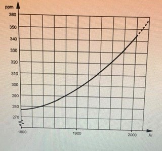 Jag kan bara uppskatta den med ögat och en tangent vid 1980 ser ut att ha 45-graders lutning, dvs. "1 ruta till höger, 1 ruta upp". Då ökar CO2 med 10 ppm när antalet år ökar med 20 år och vi får förändringen till 10/20=1/2=0.5 ppm CO2/år