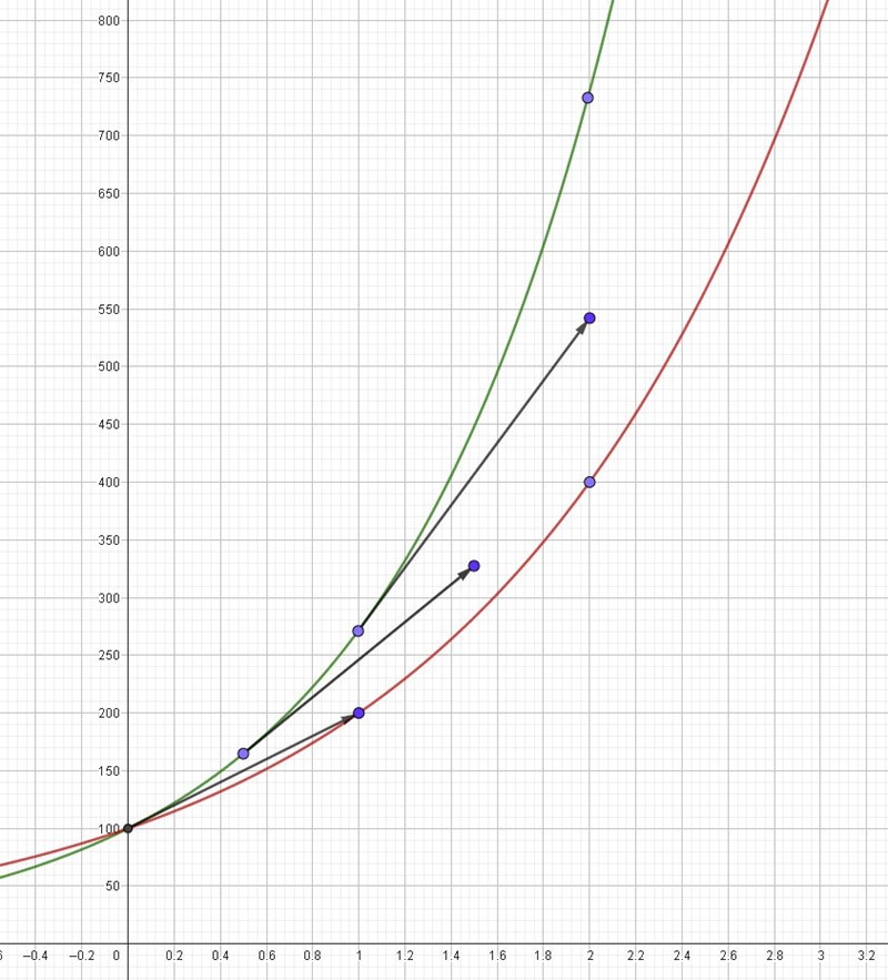 Om man kontiunerligt har en derivata f'(x) = 1*f(x) kommer tillväxten i början att "peka mot" 200 kr ett år senare, men det är inte samma sak, eftersom man under årets lopp får mer pengar, och tillväxten hela tiden "pekar mot" det dubbla beloppet ett år senare. Du ser det i den gröna kurvan. De svarta pilarna visar hur tillväxten "pekar mot" det dubbla beloppet ett år senare.