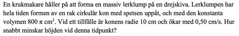 Börja med att beskriva hur man räknar ut volymen för en kon, om man vet radien och höjden.