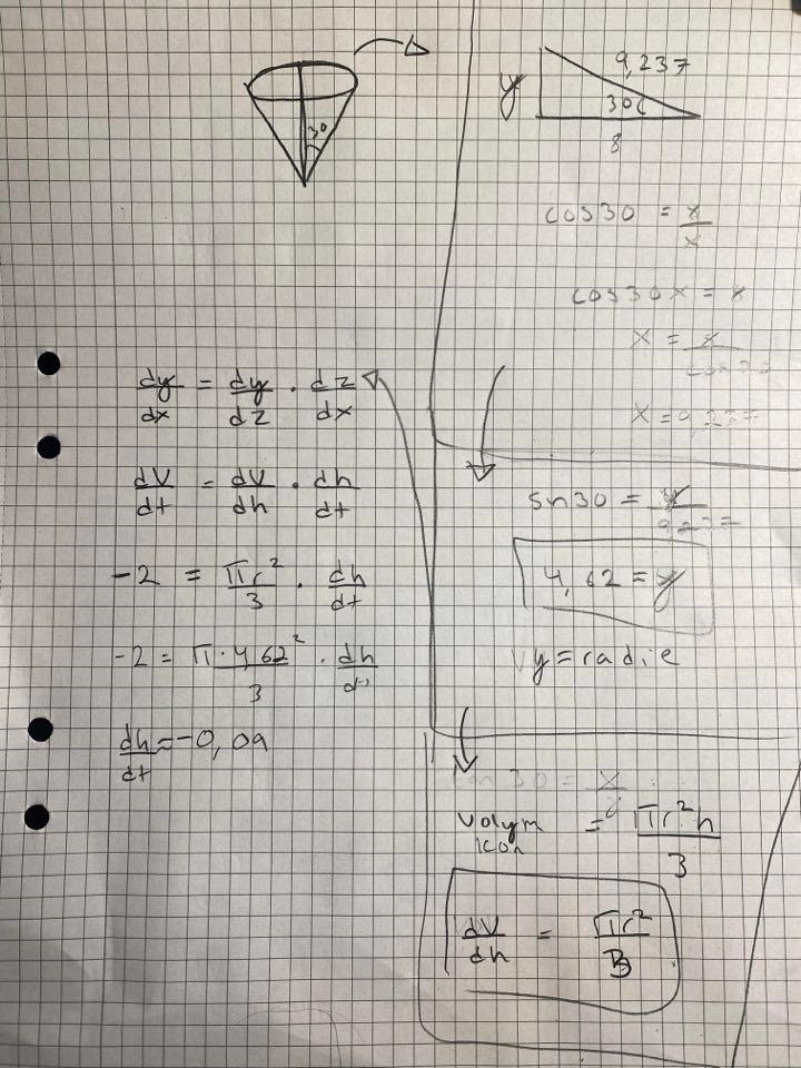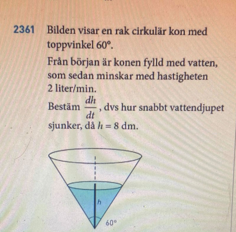 Hej! Jag har fastnat på följande fråga. Jag har löst den men får fel svar och förstår inte varför då det känns som att jag gjorde den rätt? (förutom att jag tog en rejäl omväg för att hitta radien då jag tog sinus och cosinus istället för att ta tangens. Jag har ritat lite pilar för att tyda min tankegång. Om det ser rörigt ut och inte går att förstå säg till isåfall! Tacksam för hjälp :) svaret ska vara 0,03 dm/min och jag har fått 0,09 dm/min