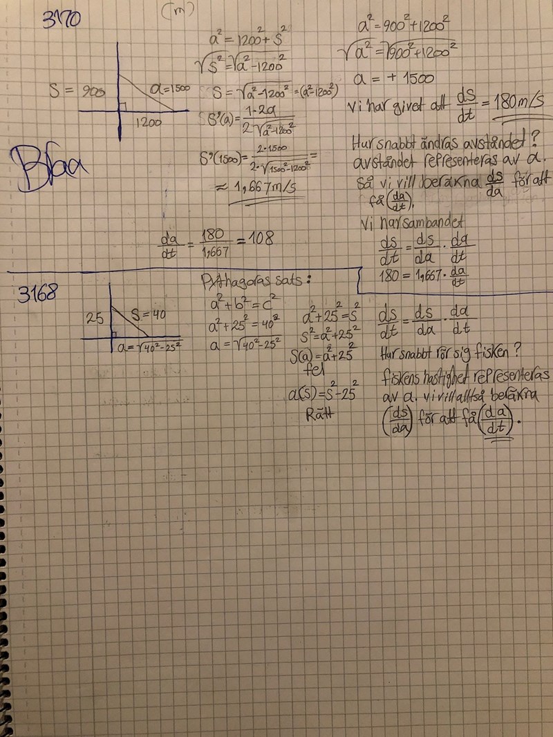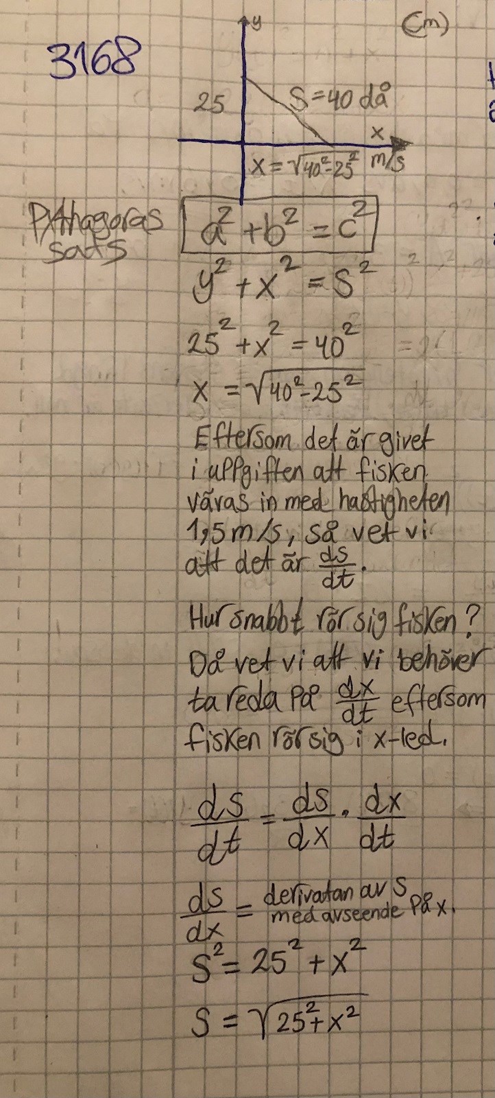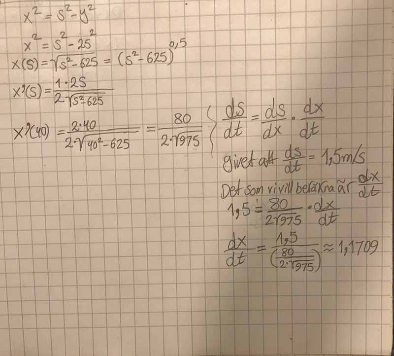 Eftersom 40 är s och inte x så har jag löst ut X ur Pythagoras sats istället för S och deriverat X. Får fortfarande fel svar. I mina uträkningar skriver jag ds/dx men det är inte det som jag räknar ut, utan dx/ds. Det är dessa beteckningar som jag blandar ihop och inte ställer upp på rätt sätt från början och det blir därför fel på slutet, tror jag iaf. Vad tycker du jag gör fel?