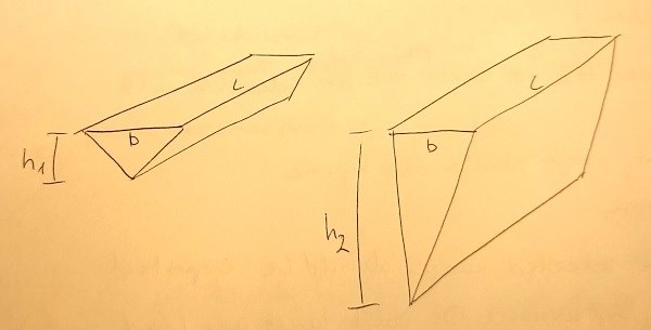 V är helt ointressant i detta fall. De här två prisman har samma dV/dh, för de har samma basyta (b*l).