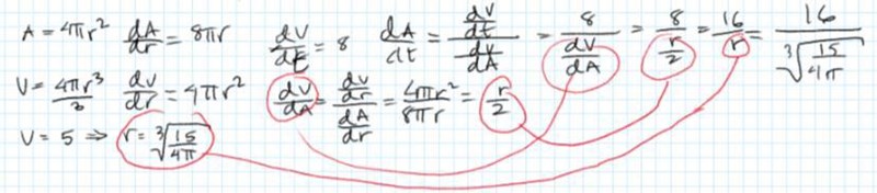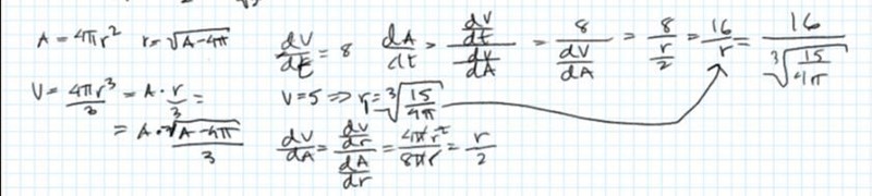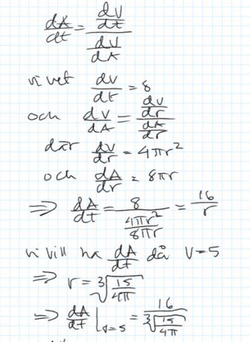 I vilken takt förändras ballongens area när den har volymen 5 cm^3 ?