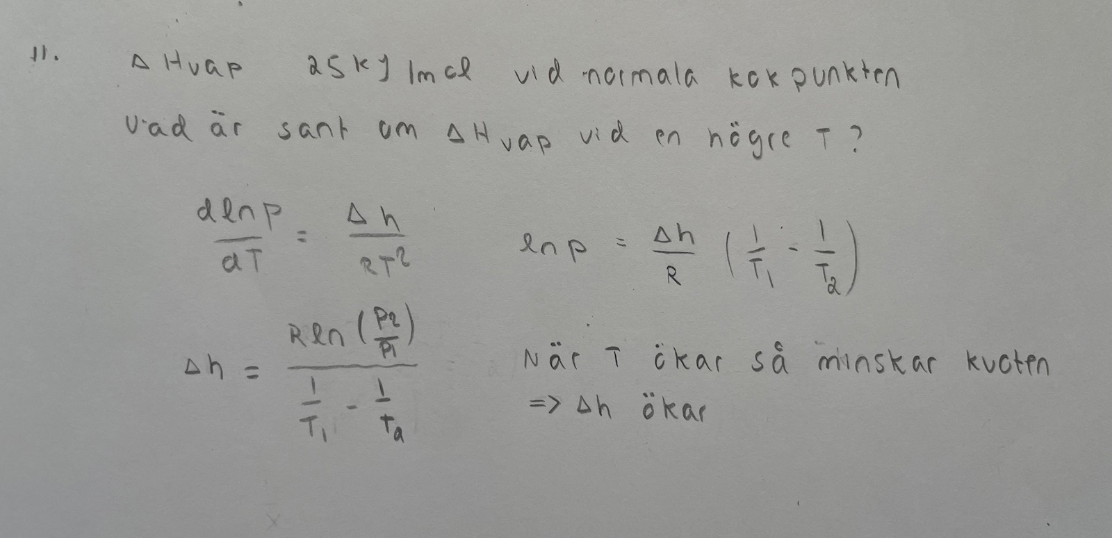 Eftersom vätskor har högre specifik värmekapacitet än gaser kan man dra slutsatsen att denna skillnad kommer vara mindre än 0. Det innebär då att förångningsentalpin kommer vara mindre än 25 kJ/mol vid den högre temperaturen.