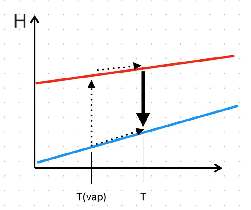 Det blir inte riktigt rätt. Man kan lösa uppgiften på flera sätt, men det enklaste kanske är att resonera utifrån Hess lag. Om vi vet ΔH vid kokpunkten T(vap) och vill veta ΔH vid en annan temperatur T > T(vap) kan man dela upp det i följande process: