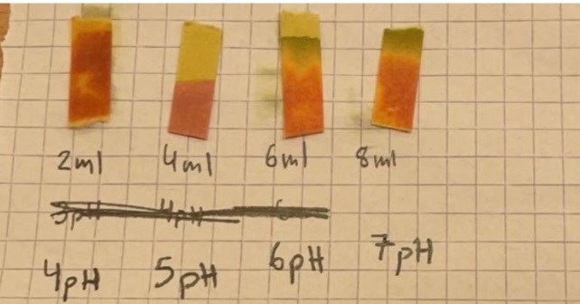 På bilden ser vi hur efter varje gång det tillsätts 2 ml NaOH så ändras färgen på pH pappret. Det beror på att det börjar ske en neutralisation. Med hjälp av en pH-skala så kunde vi se pH värdet efter varje steg.