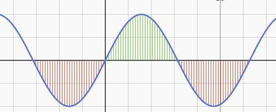 Arean som representerar integralen är den gröna arean (1) minus de två röda areorna (1 vardera). Alltså 1 - 2 = - 1